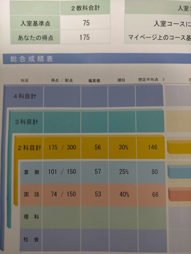 7月に受けた試験と比べると、国語がだいぶ下がってしまったが、代わりに算数が良くなっている。